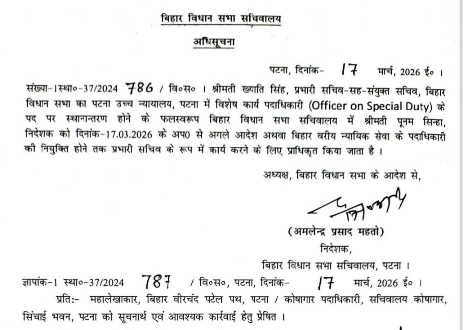 बिहार विधान सभा की निदेशक पूनम सिन्हा प्रभारी सचिव बनीं