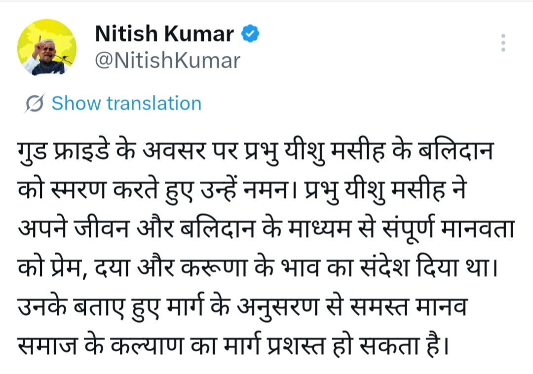 बिहार के मुख्यमंत्री नीतीश कुमार ने ट्विटर पर ट्वीट करते हुए आज गुड फ्राइडे इसहामासी के बलिदान के बारे में कहा है उन्हें प्रणाम करते हुए ट्वीट करते हुए कहा है